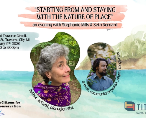 Join us on Wednesday, January 14th, 2026 at The Grand Traverse Circuit for a chance to hear from legendary local luminary, Stephanie Mills, and to benefit Title Track! Author, activist and bioregionalist Stephanie Mills will give an encore presentation of her speech “Starting from and Staying with the Nature of Place” first delivered as the keynote address for the 18th Annual Freshwater Summit.